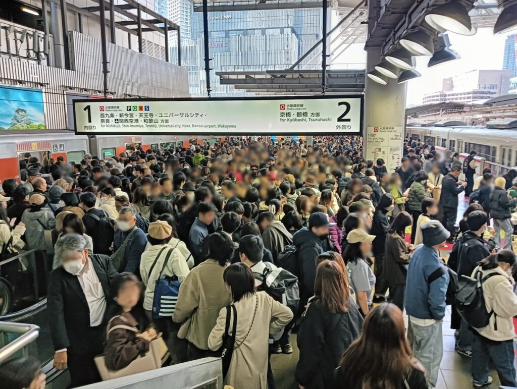 週末の大阪駅は相変わらずですが、先日のユニバーサルスタジオ行きの西九条駅は